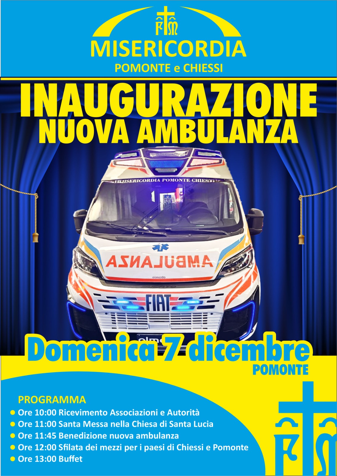 Alle 11:45 si terrà la benedizione della nuova ambulanza e, a seguire, è prevista la sfilata dei mezzi di soccorso nei paesi di Chiessi e Pomonte.